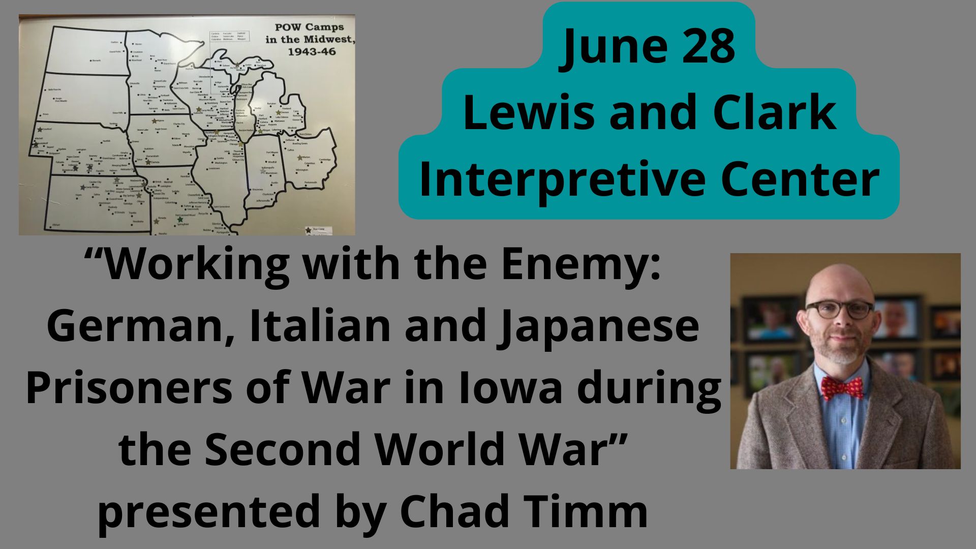 On Sunday, June 28, 2026, at 2:00pm, in the Betty Strong Auditorium, historian/educator/lecturer Chad Timm will share the captivating history of “Working with the Enemy: German, Italian and Japanese Prisoners of War in Iowa during the Second World War.”